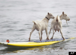 The goats stood on surfboards and cruised along waves Wednesday at San Onofre State Beach, as bystanders watched in amazement.