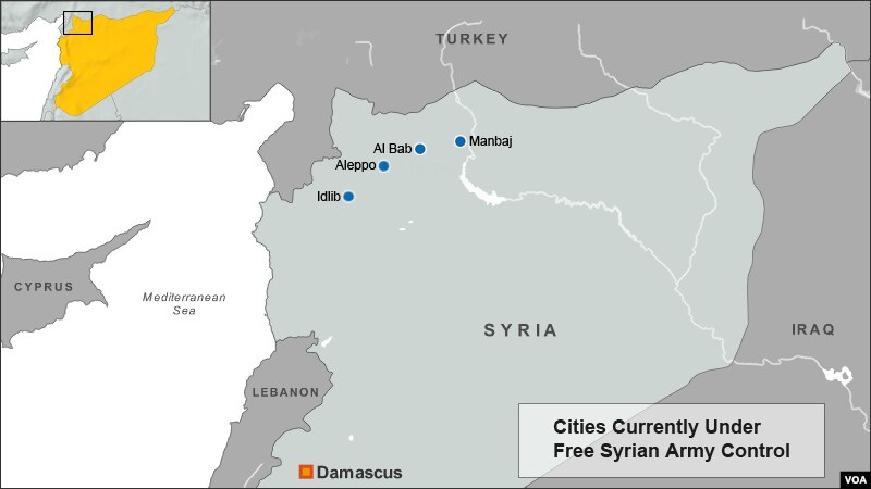 Al-Bab isn’t the only town trying to deal with the practical challenges of governing in the enclave rebels have carved out in northern Syria stretching 30 kilometers south from the Turkish frontier and bordered by Idlib in the west to the cities of al-Bab and Manbaj in the east and parts of Aleppo to the south.
